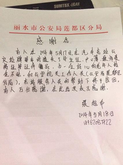 東站服務(wù)臺的楊大姐翻看了袋中物品,是一本本各式各樣的證書,總共有六本,主人名叫張超華。楊大姐心想:“這么多的證書丟了一定非常著急,有些逗還補不回來呢”。于是,她通過戶口簿上的信息,在東站派出所的幫助下找到失主。而失主也早已報了警,在派出所留下了手機號碼。